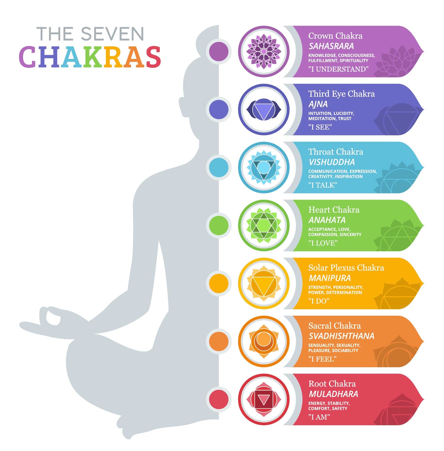 The Seven Chakras are the main energy centres of the body. You’ve probably heard people talk about “unblocking” their chakras, which refers to the idea that when all of our chakras are open, energy can run through them freely, and harmony exists between the physical body, mind, and spirit. Chakra translates to “wheel” in Sanskrit, and you can imagine them like wheels of free-flowing positive energy.